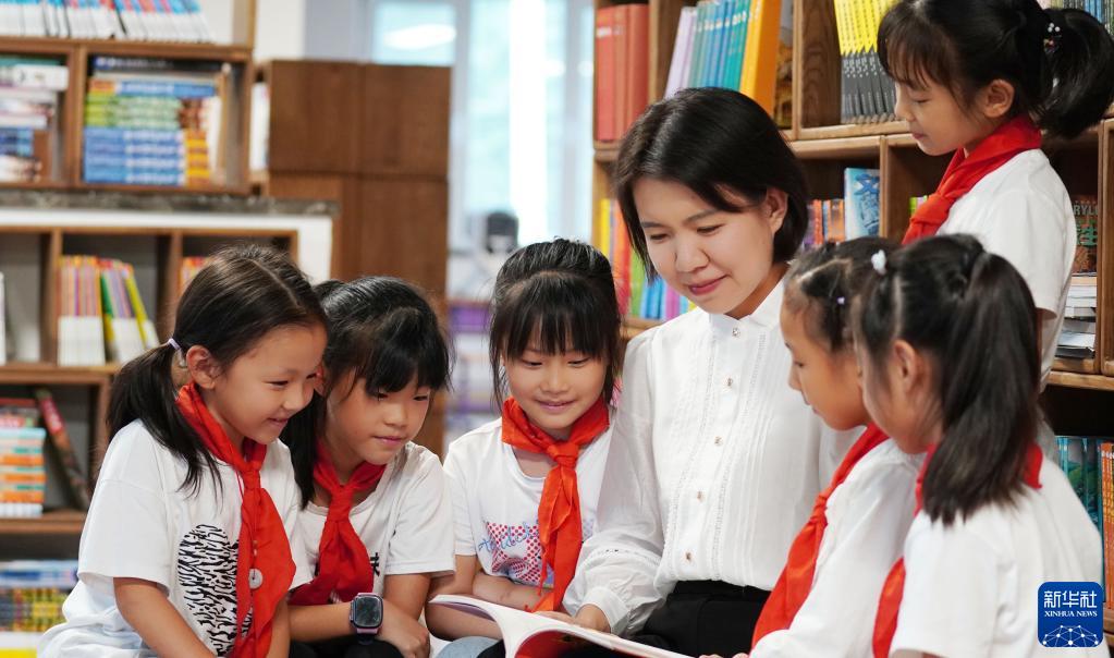 9月7日,沈阳市浑南区第九小学教师陈秋颖陪伴学生阅读。新华社发
