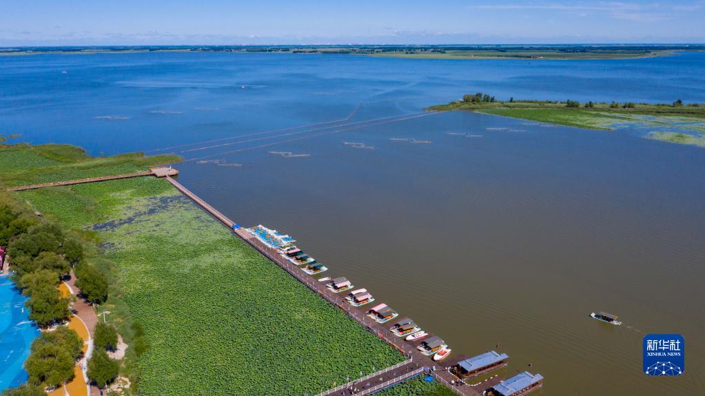 游客在吉林省松原市查干湖参观游览(无人机照片,9月18日摄)。 新华社记者 许畅 摄