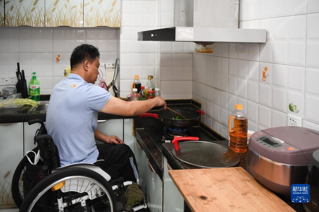 湖南省长沙市天心区家中,徐经卓在定制低位灶台上炒菜(2021年8月25日摄)。新华社记者 薛宇舸 摄