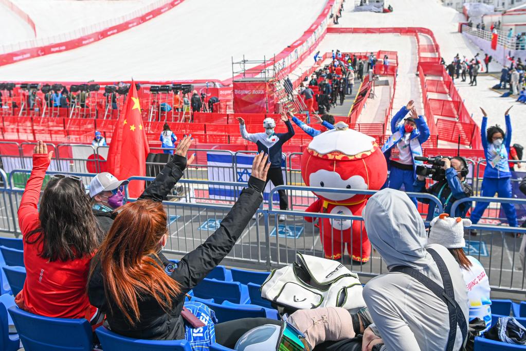 3月10日,在延庆国家高山滑雪中心,观众在开赛前与“雪容融”互动。新华社记者江汉摄