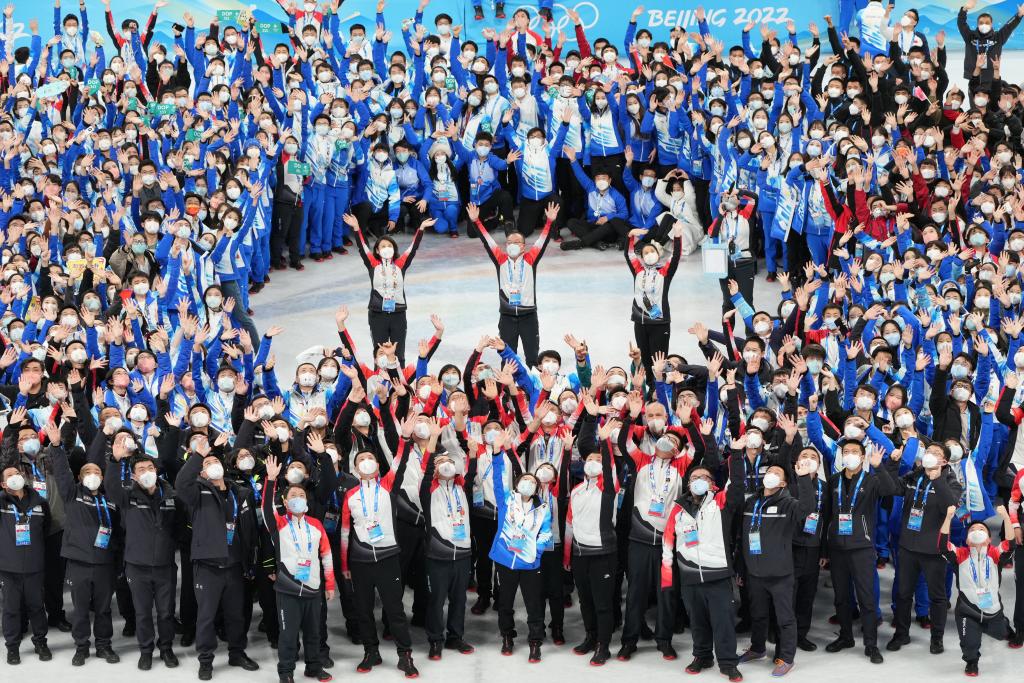 2月20日,北京冬奥会举行花样滑冰表演滑工作人员和志愿者在表演滑结束后合影留念。新华社记者王毓国摄