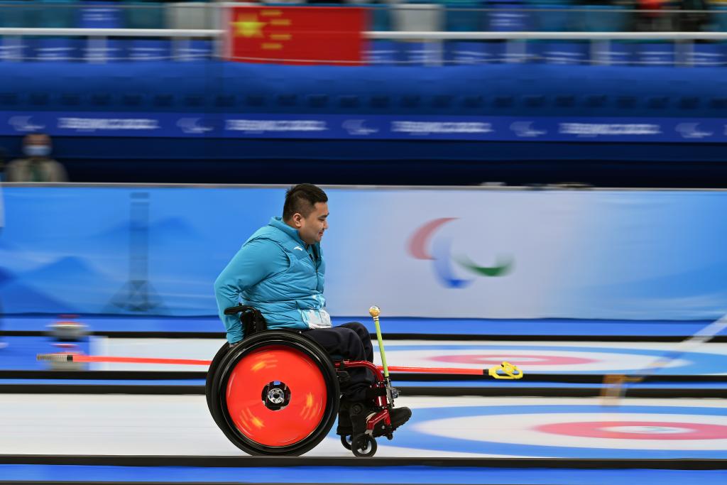 3月12日,北京2022年冬残奥会轮椅冰壶金牌赛中,中国队以8比3战胜瑞典队,夺得冠军,图为中国队选手王海涛在比赛中。新华社记者李尕摄