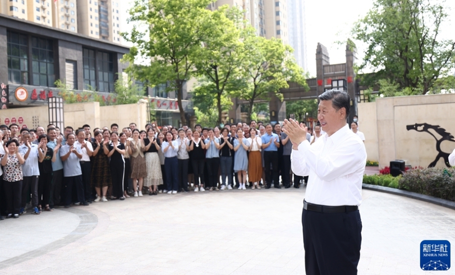 2022年6月28日,中共中央总书记、国家主席、中央军委主席习近平在湖北省武汉市考察。这是28日下午,习近平在东湖高新区左岭街道智苑社区广场同干部群众亲切交流。新华社记者 鞠鹏 摄