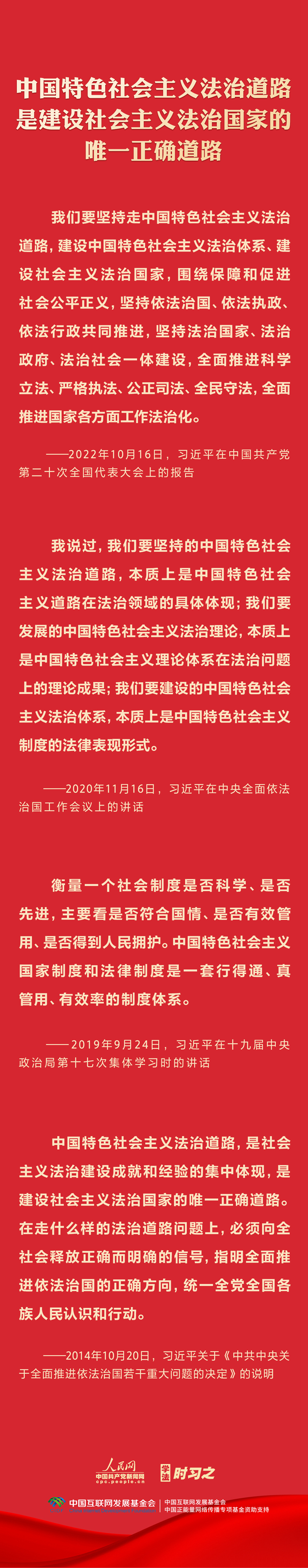 今年是贯彻落实党的二十大精神的开局之年。中共中央政治局决定从今年4月开始,在全党自上而下开展学习贯彻习近平新时代中国特色社会主义思想主题教育。习近平法治思想是习近平新时代中国特色社会主义思想的重要组成部分,人民网·中国共产党新闻网推出学法时习之·学习习近平法治思想系列策划,本篇聚焦“坚持中国特色社会主义法治道路”。