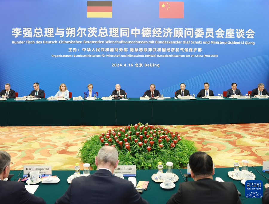 4月16日下午,国务院总理李强在北京人民大会堂和德国总理朔尔茨共同出席中德经济顾问委员会座谈会,同与会企业家交流。新华社记者 王晔 摄