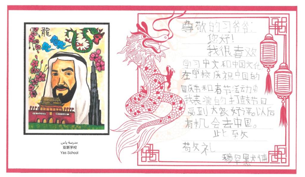 中文名叫“朱婉儿”的12年级学生朱韦雷娅在信中画下龙与长城,她说如今学中文的阿联酋学生越来越多,“相信中阿友好关系将会更加紧密”。