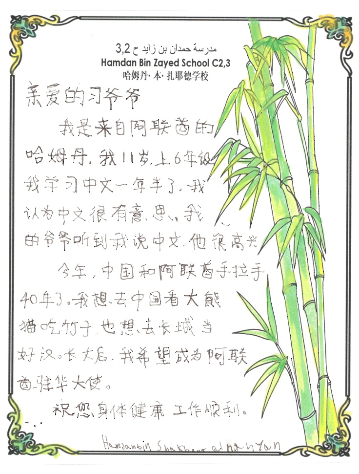 哈姆丹学校是阿联酋最早开设中文课程的学校。该校6年级学生哈姆丹学中文已有一年多。他在信中写道:“今年,中国和阿联酋手拉手40年了。”他特意在信中涂绘了几株青翠的竹子,向习爷爷表达自己的小心愿——去中国看大熊猫吃竹子!他还“想去长城当好汉”,将来“成为阿联酋驻华大使”。