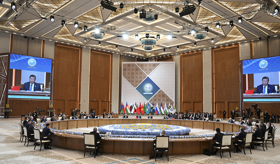新华社阿斯塔纳7月4日电(记者胡晓光 韩墨 杨依军)当地时间7月4日上午,国家主席习近平在阿斯塔纳独立宫出席上海合作组织成员国元首理事会第二十四次会议。