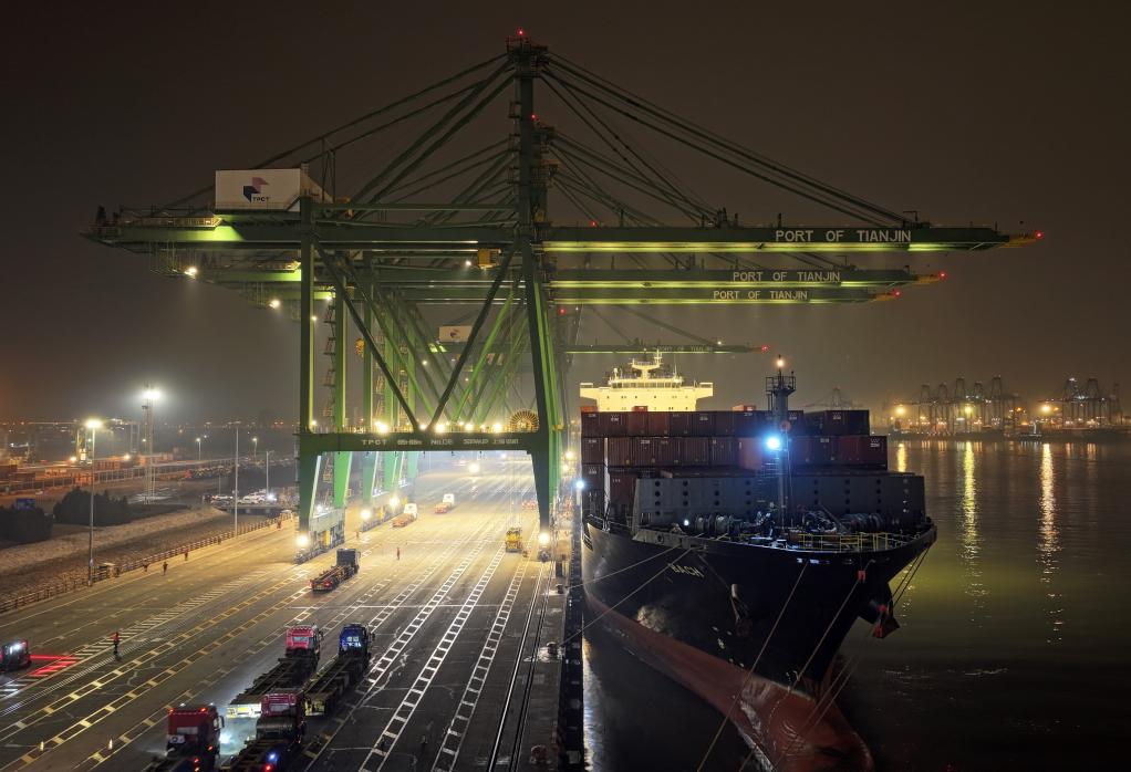 1月16日,大型集装箱班轮“巴赫”号靠泊在天津港太平洋国际集装箱码头(无人机照片)。天津港首条直通南美“车厘子快线”正式开通。