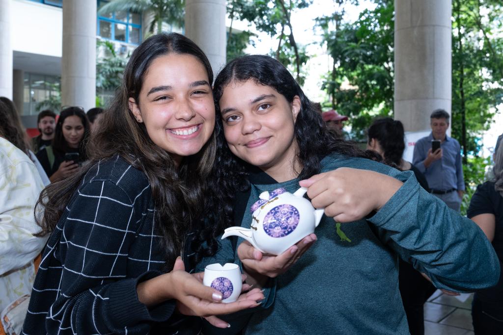 4月18日,在巴西里约热内卢举行的联合国中文日活动上,巴西学生与中国工艺品合影。