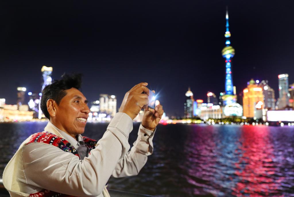 2023年11月2日,秘鲁手工艺人奥斯瓦尔多·马马尼来中国参加第六届进博会时,在上海外滩游览。