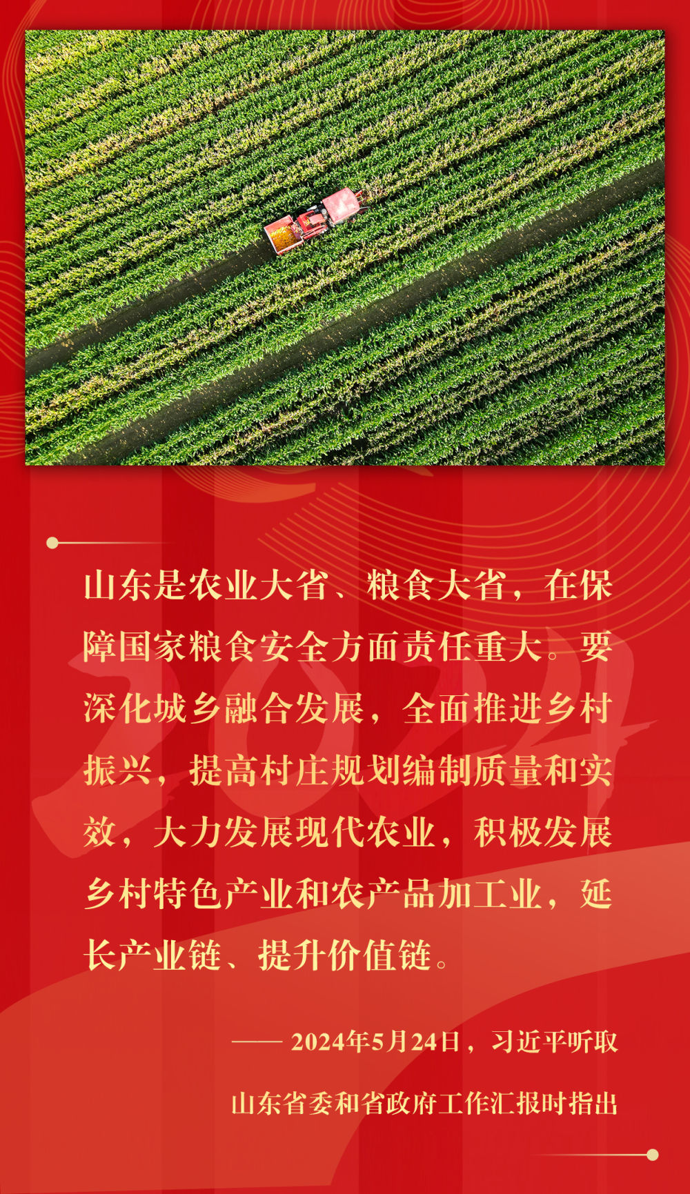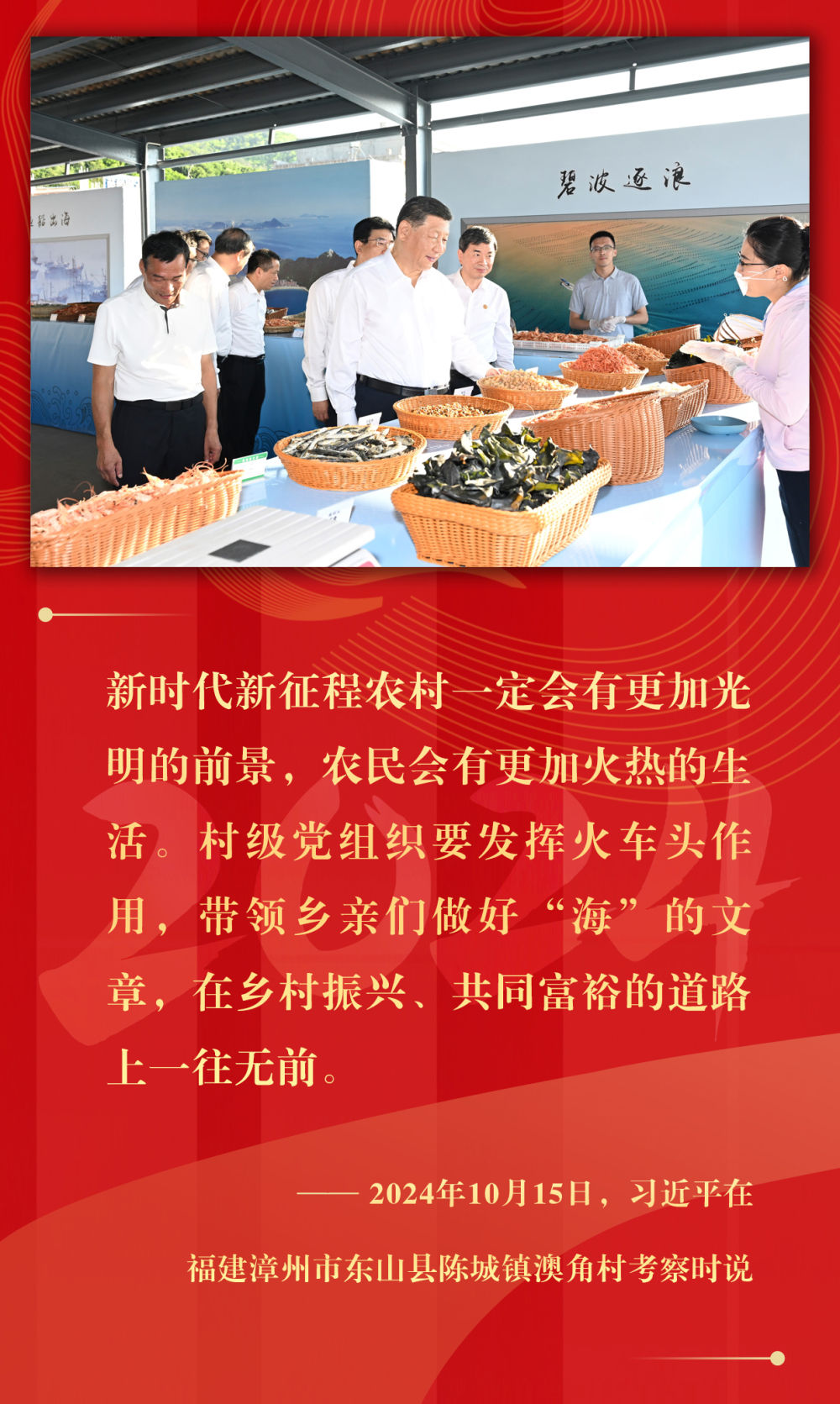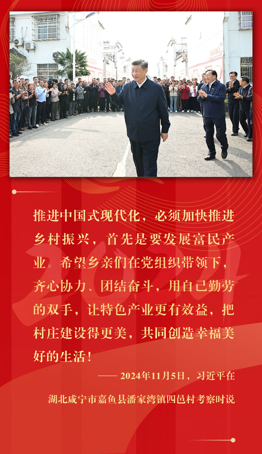 坚持城乡融合发展、持续深化农村改革、支持强农惠农富农、拓宽农民增收渠道、强化农业科技和装备支撑、确保粮食和重要农产品稳产保供……2024年,习近平总书记在基层考察期间,持续关注乡村振兴,多次提出重要指示,落子关键处、科学谋布局,千方百计推动农业增效益、农村增活力、农民增收入。