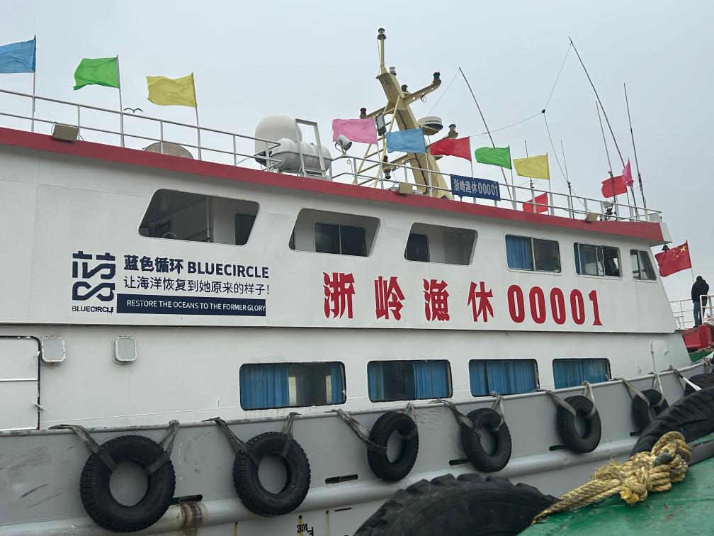 浙江台州温岭一艘休闲渔船上印着“蓝色循环”的标志。新华社记者 黄筱 摄