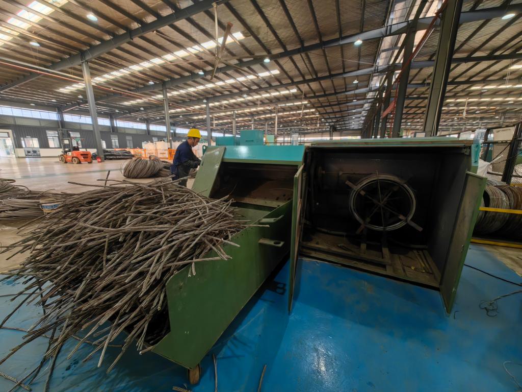 在国网重庆电力再生资源循环利用中心,工人正用机器拆解钢芯铝绞线。新华社记者 周凯 摄