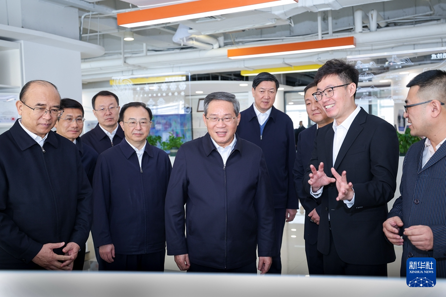 2月15日,中共中央政治局常委、国务院总理李强在黑龙江调研。这是在哈尔滨文化旅游规划设计院有限公司,李强察看冰雪大世界项目等设计成果及文创产品。新华社记者 刘彬 摄