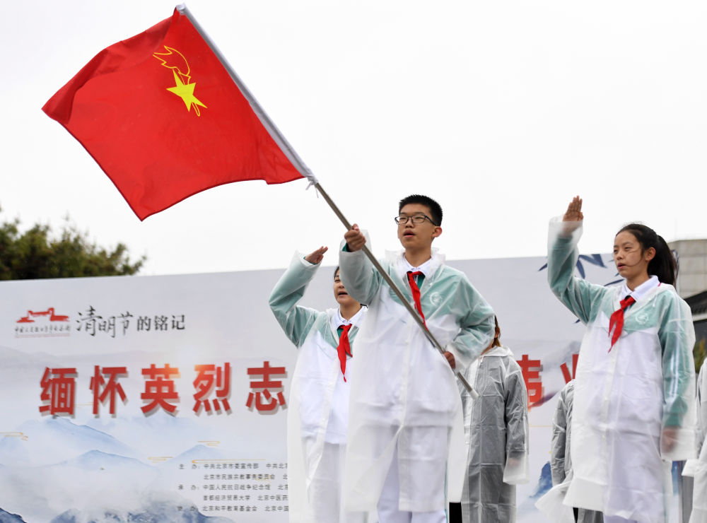 2023年4月4日,“清明节的铭记——缅怀英烈志 创造新伟业”主题教育系列活动启动仪式在中国人民抗日战争纪念馆举行。这是少先队员代表在启动仪式上高唱《我们是共产主义接班人》。