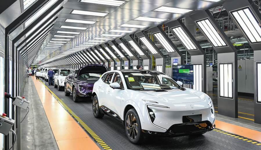 位于重庆市渝北区的长安汽车数智工厂总装车间拍摄的即将下线的新能源汽车(2025年3月6日摄)。王全超摄/本刊
