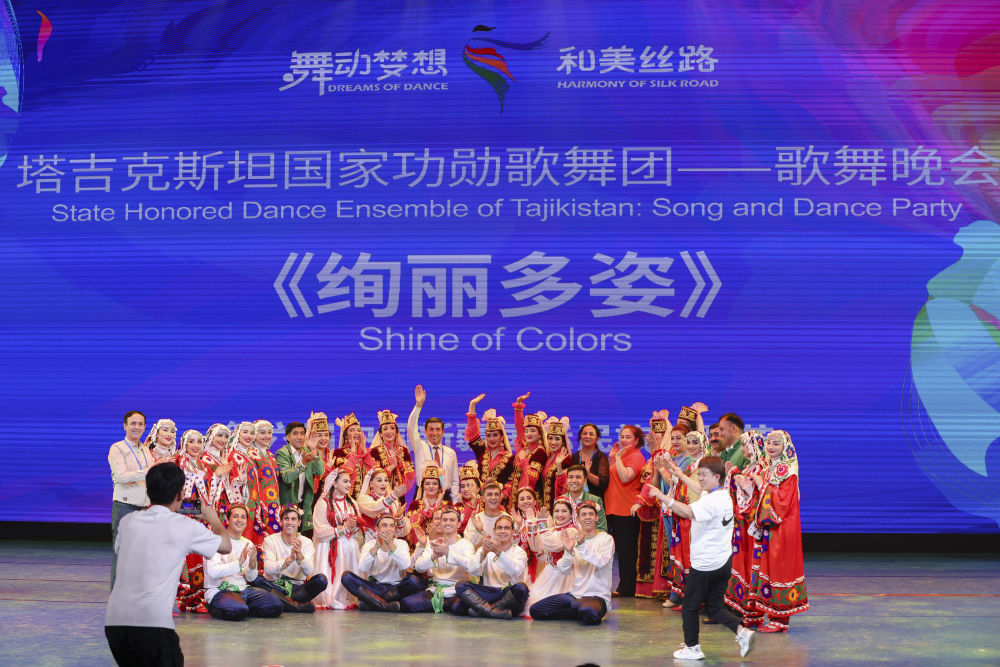 2023年7月27日,由塔吉克斯坦罗拉国家功勋歌舞团带来的歌舞晚会《绚丽多姿》在新疆乌鲁木齐晚报剧院上演。这是演员在演出结束后合影留念。