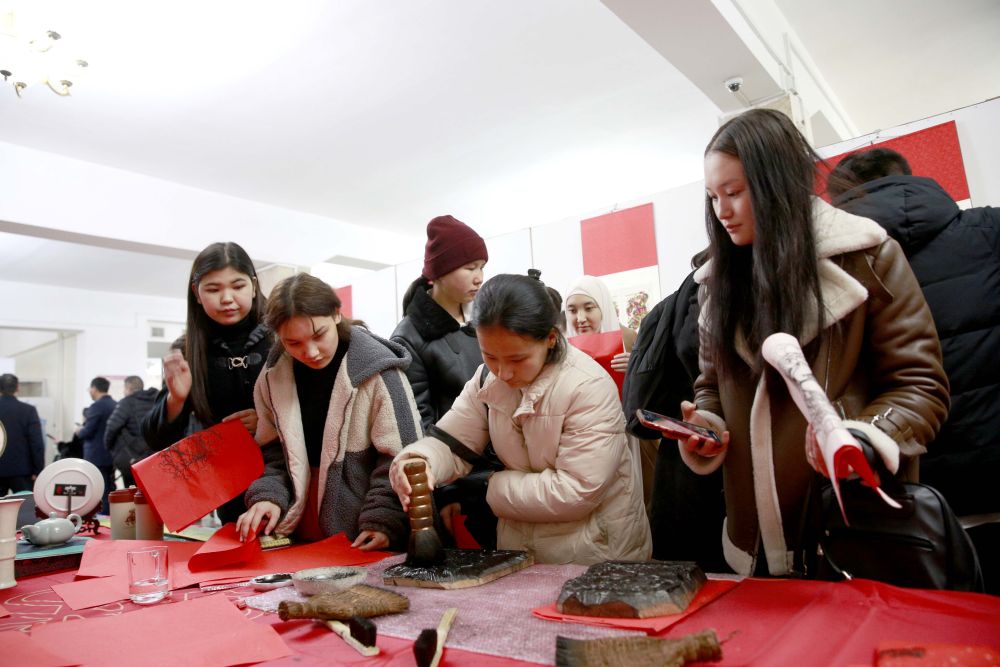 2023年12月26日,人们在吉尔吉斯斯坦比什凯克举行的“一带一路”暨中原文化交流展上体验中国文化。本次展览主要展出了以“拓传春秋”为主题的石刻艺术及以“年画”为主题的木刻和剪纸艺术作品。