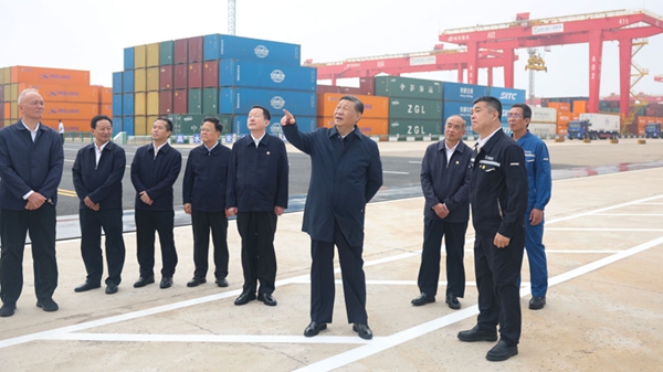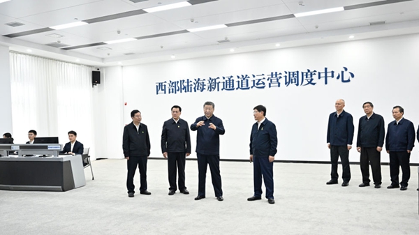 4月22日,习近平在重庆国际物流枢纽园区,了解当地加快建设西部陆海新通道等情况。
