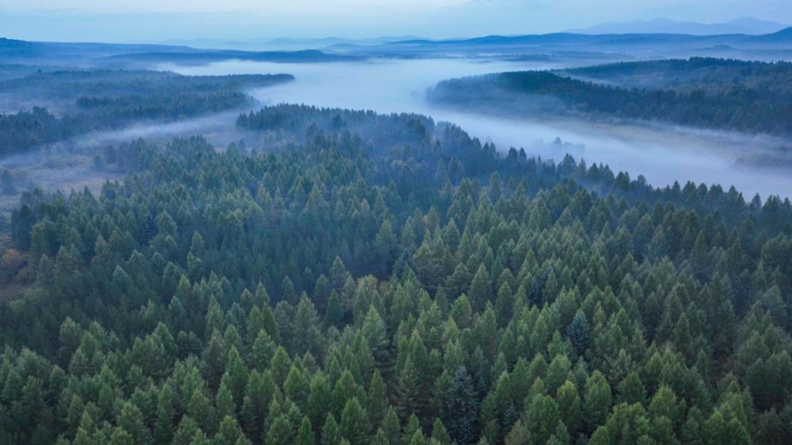 站在河北塞罕坝机械林场的望海楼上远眺,一片林海染绿了坝上地区,又向东南方向绵延,与另一抹绿色——内蒙古喀喇沁旗马鞍山林场相接。