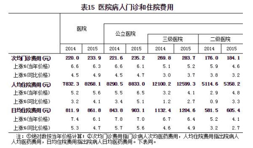 在大家关心的医药费用方面,公报数据显示,2015年医院次均门诊费用233.9元,按可比价格上涨4.9%;人均住院费用8268.1元,按可比价格上涨4.1%。