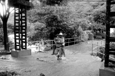 太师屯消防中队迅速转战赶往现场救援。约半小时后,消防员抵达朱家湾村时受阻,此时的清水河里水流浑浊,水位急速上涨,通往大岭村的朱家湾桥距水面只有半米高,桥面上积水齐膝深,消防车无法通过。消防员只好携带装备徒步前行。