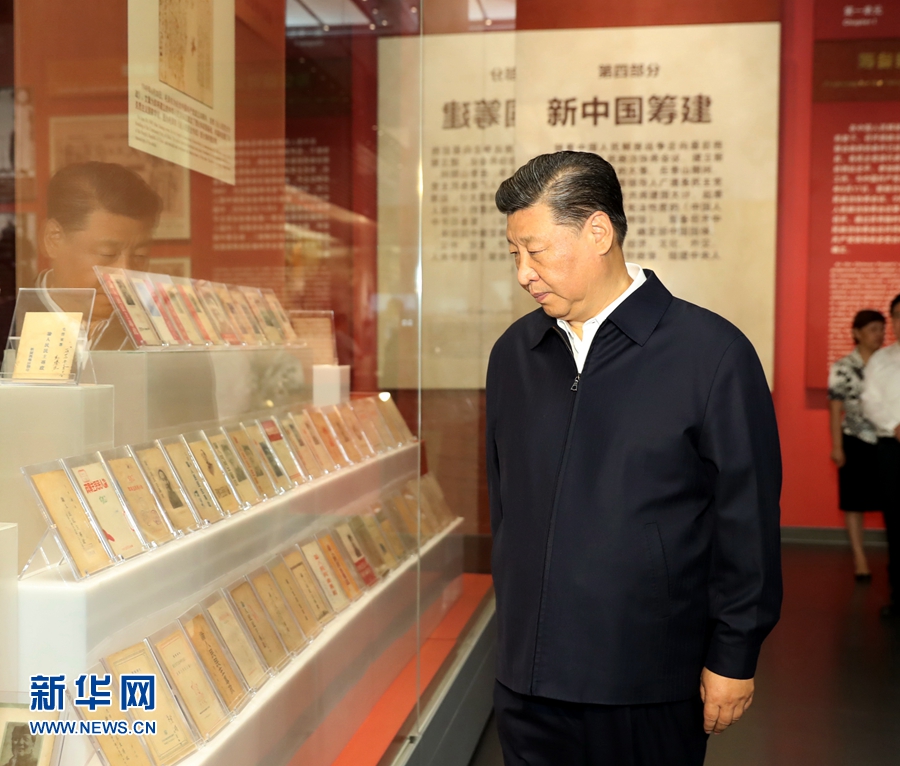 9月12日,中共中央总书记、国家主席、中央军委主席习近平视察中共中央北京香山革命纪念地。这是习近平在香山革命纪念馆参观《为新中国奠基》主题展览。 新华社记者 黄敬文 摄