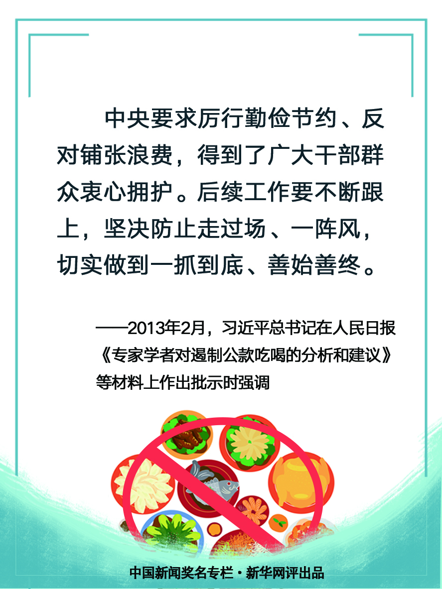 打好“厉行节约、反对浪费”这场战斗,贵在坚持不懈,重在建立健全长效机制,织密扎牢法治之网,让每个浪费之举都有法来管、执法必严、违法必究,让每个浪费者心里有防线、有畏惧,不敢越“雷池”、碰“高压”。只有以锲而不舍、驰而不息的精神抓下去,才能推动厉行节约、反对浪费在点点滴滴的变化和实实在在的成效中聚合成力、蔚然成风。(文字:张倩 海报:张倩)