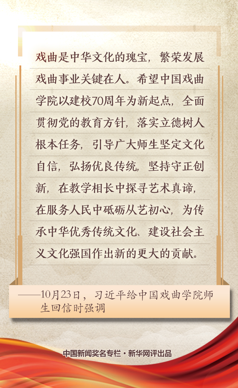 戏曲是中华文化的瑰宝,具有悠久的历史、独特的艺术魅力和深厚的群众基础。近日,习近平总书记给中国戏曲学院师生回信,对他们传承发展好戏曲艺术提出殷切期望。这不仅让戏曲文化从业者倍加鼓舞,更为文艺事业的繁荣发展注入了强心剂。