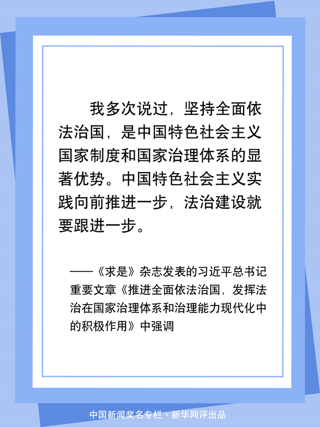 中国特色社会主义实践向前推进一步,法治建设就要跟进一步。不久前,党的十九届五中全会为中国擘画了一幅波澜壮阔的新图景。9000万人的大党、14亿人的大国将从这里昂首阔步再出发。在通往伟大目标的征途上,推进国家治理体系和治理能力现代化是必由之路。其中,提高党依法治国、依法执政能力,用法治保障人民当家作主,坚持和完善中国特色社会主义法治体系,更好发挥法治对改革发展稳定的引领、规范、保障作用,建设高素质法治工作队伍,是我们必须着重把握的几个方面。只有切实推进全面依法治国,更好把社会主义法治优势转化为国家治理效能,才能推动伟大事业走向新的辉煌。
