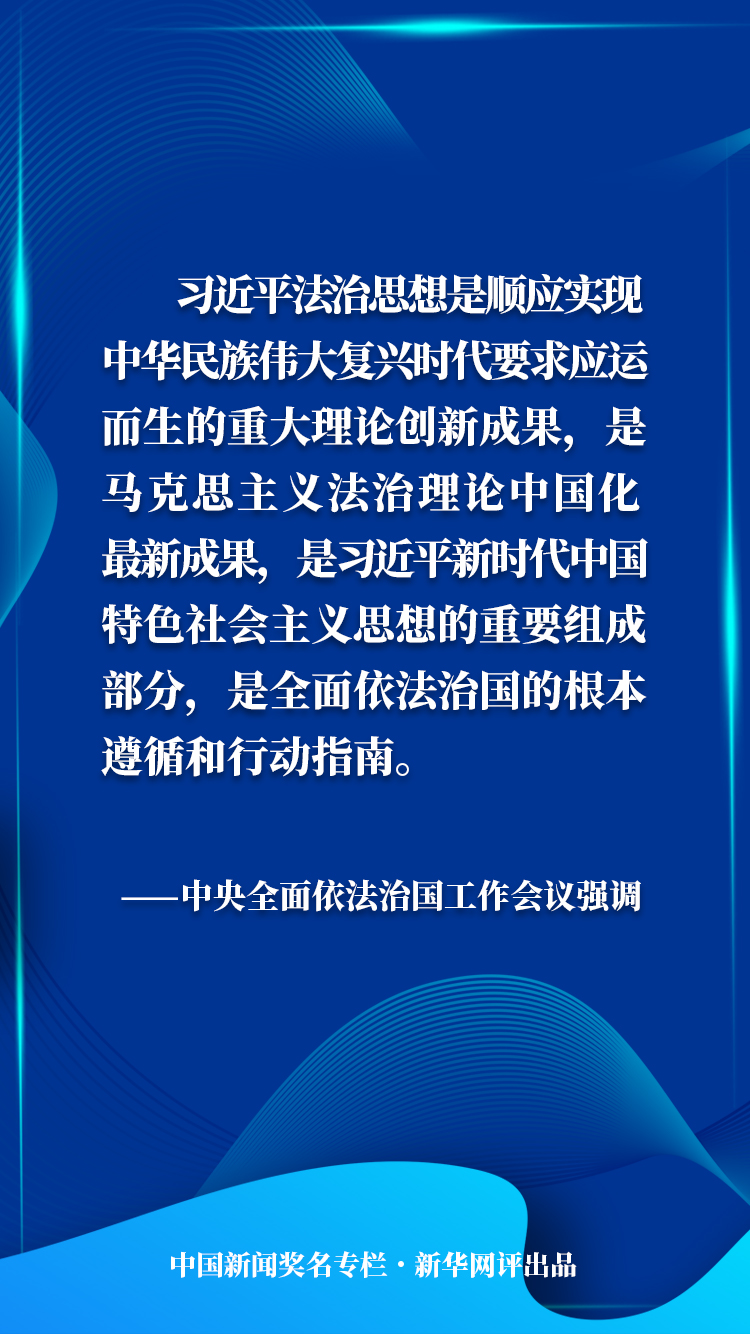 中央全面依法治国工作会议11月16日至17日在北京召开。会议强调,习近平法治思想是顺应实现中华民族伟大复兴时代要求应运而生的重大理论创新成果,是马克思主义法治理论中国化最新成果,是习近平新时代中国特色社会主义思想的重要组成部分,是全面依法治国的根本遵循和行动指南。全党全国要认真学习领会习近平法治思想,吃透基本精神、把握核心要义、明确工作要求,切实把习近平法治思想贯彻落实到全面依法治国全过程。