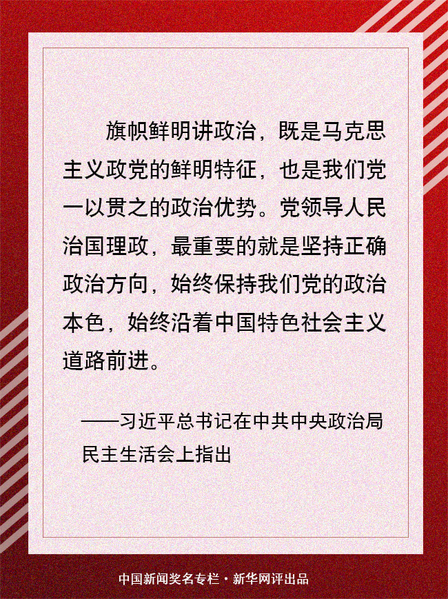“旗帜鲜明讲政治,既是马克思主义政党的鲜明特征,也是我们党一以贯之的政治优势。”在近日举行的中共中央政治局民主生活会上,习近平总书记发表重要讲话,对全党上下加强政治建设、提高政治能力、坚守人民情怀等提出明确要求,具有重大而深远的指导意义。