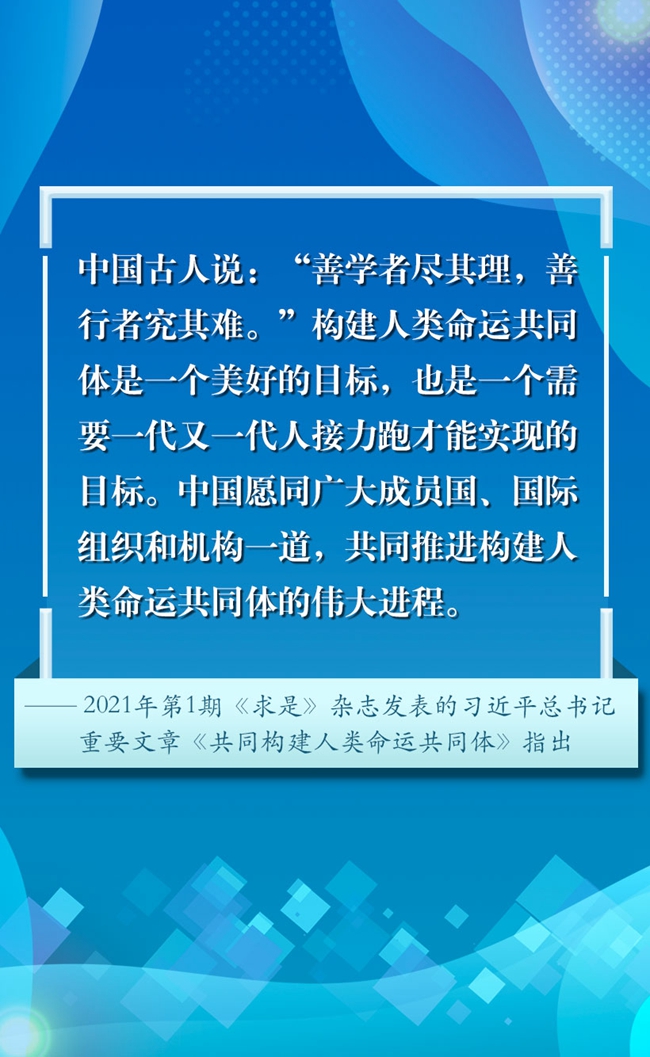 大道不孤,天下一家。构建人类命运共同体是一个美好的目标,也是一个需要一代又一代人接力跑才能实现的目标。我们要始终坚持这一正确选择,以宽广视野、开放胸襟和积极担当,团结合作、同舟共济,和世界各国一起,共同创造更加美好的未来。(文字:马若虎 海报:樊珊珊)