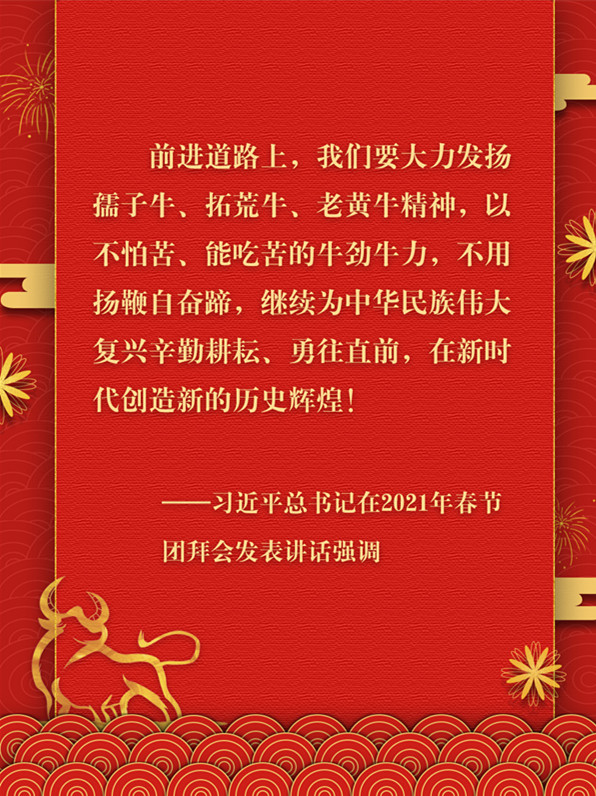 2021年,辛丑牛年。春节团拜会上,习近平总书记继全国政协新年茶话会之后,再次提出要大力发扬孺子牛、拓荒牛、老黄牛“三牛”精神,号召以不怕苦、能吃苦的牛劲牛力,不用扬鞭自奋蹄,继续为中华民族伟大复兴辛勤耕耘、勇往直前,在新时代创造新的历史辉煌。掷地有声的话语,是对过去全国上下风雨无阻、奋勇向前的充分肯定,也是对未来继续攻坚克难、开拓前行的殷切寄望。