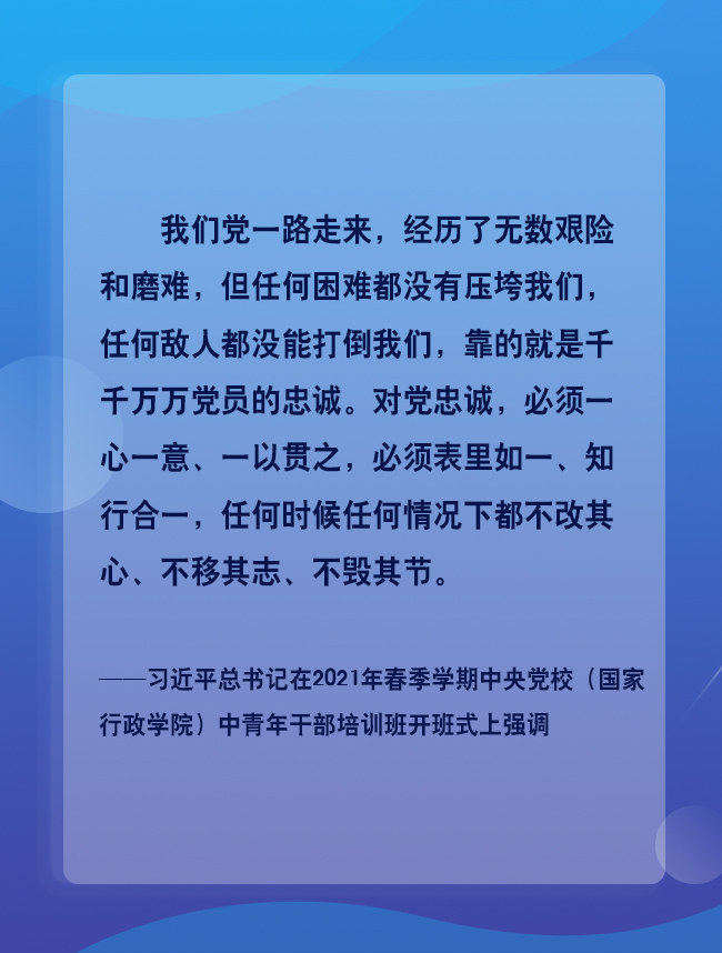 对党忠诚,是共产党人首要的政治品质。在2021年春季学期中央党校(国家行政学院)中青年干部培训班开班式上,习近平总书记深刻阐述对党忠诚的重要意义,谆谆告诫全党:对党忠诚,必须一心一意、一以贯之,必须表里如一、知行合一,任何时候任何情况下都不改其心、不移其志、不毁其节。