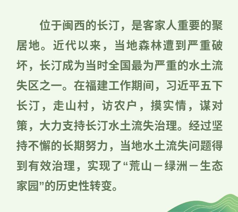 在福建工作时期,习近平着眼长远,提出了一系列生态文明建设的创新理念,部署推进一系列生态文明建设的重大实践,亲自推动了长汀水土流失治理、木兰溪防洪工程等重大生态保护工程。2000年,习近平推动福建率先在全国探索生态省建设,亲自领导编制《福建生态省建设总体规划纲要》,为福建生态省建设作出远景规划。