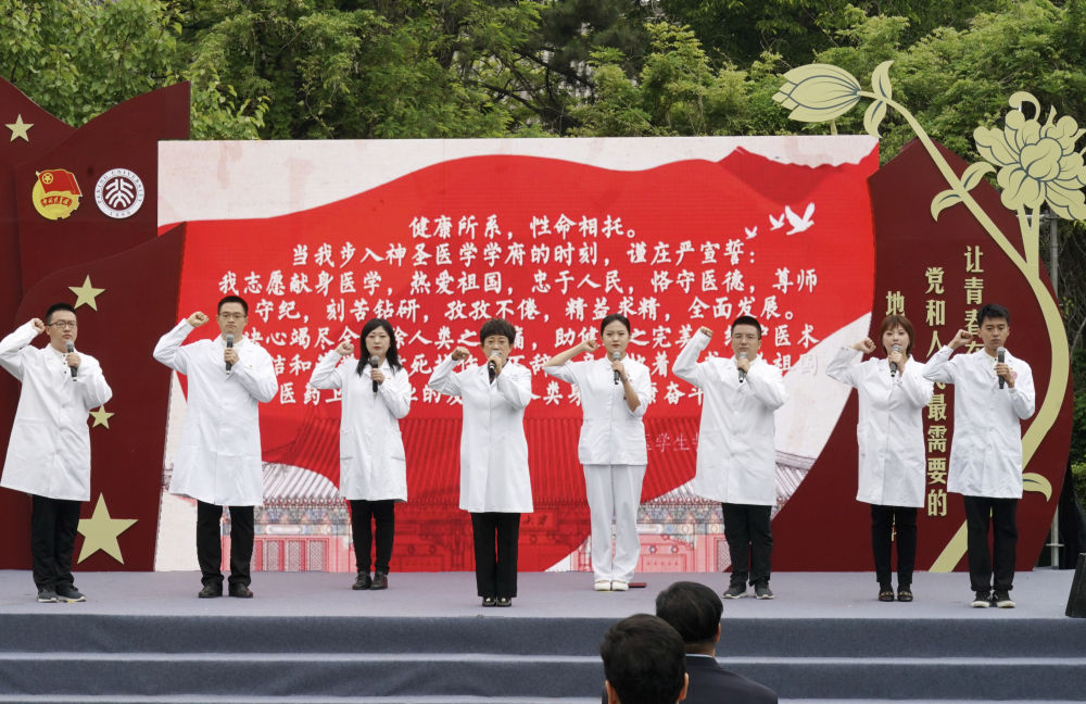 ↑2020年5月4日,北京大学援鄂医疗队代表在北大五四青春诗会上宣誓。