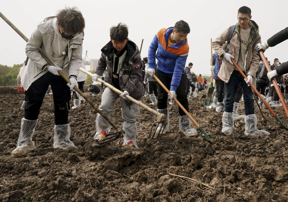 ↑2021年3月21日,在上海交通大学新农科劳动教育课上,学生们在平整土地。