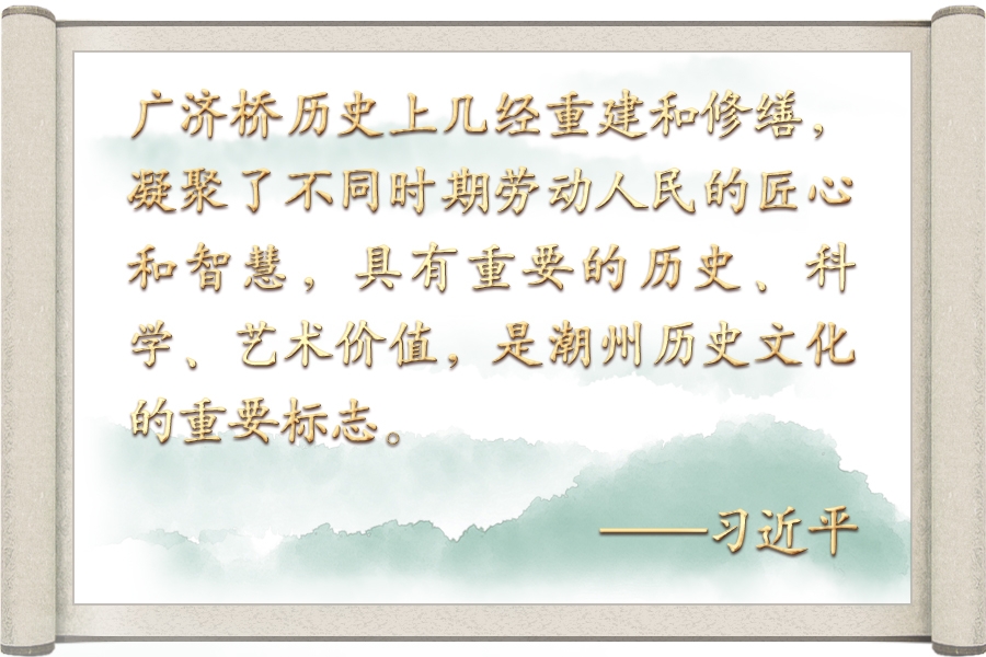 2020年10月12日,习近平总书记在广东考察时来到潮州市。在潮州古城东门外的广济桥,习近平总书记沿桥步行,察看桥亭、浮桥,眺望韩江两岸风貌,了解桥梁历史文化特色,听取广济桥修复保护情况介绍。习近平总书记强调,要珍惜和保护好这份宝贵的历史文化遗产,不能搞过度修缮、过度开发,尽可能保留历史原貌。