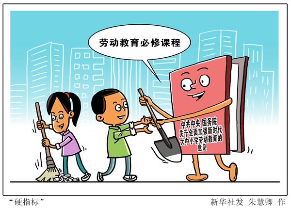 新华社北京3月26日电(记者施雨岑)把劳动教育纳入人才培养全过程、在大中小学设立劳动教育必修课程、每年有针对性地学会1至2项生活技能……《中共中央 国务院关于全面加强新时代大中小学劳动教育的意见》近日印发,近年来被淡化、弱化的劳动教育有了“硬指标”。