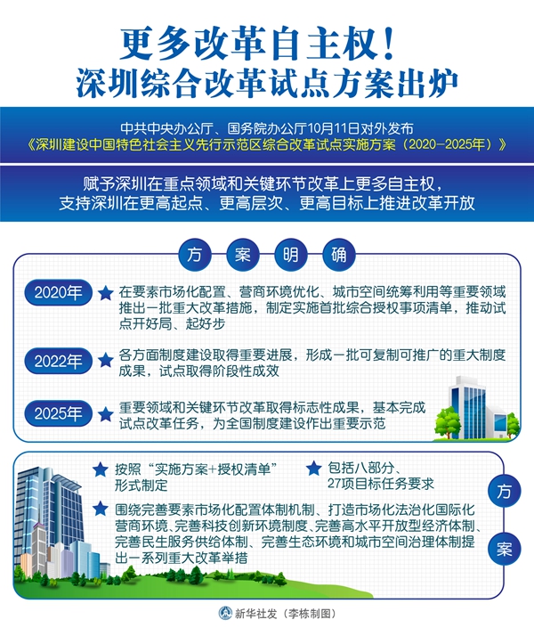 新华社北京10月11日电(记者安蓓、叶前)中共中央办公厅、国务院办公厅11日对外发布《深圳建设中国特色社会主义先行示范区综合改革试点实施方案(2020-2025年)》,赋予深圳在重点领域和关键环节改革上更多自主权,支持深圳在更高起点、更高层次、更高目标上推进改革开放。