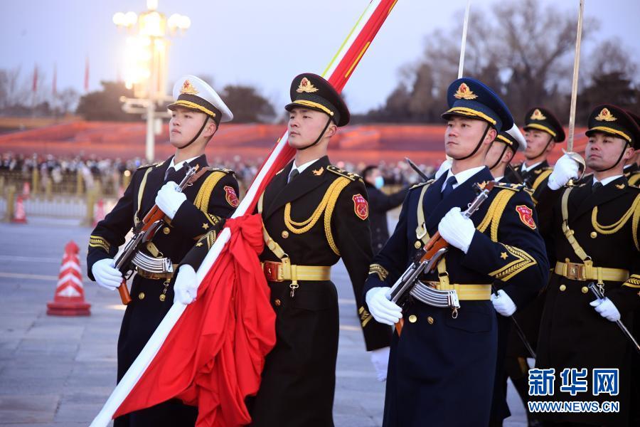 7时36分,雄浑激昂的义勇军进行曲响起,五星红旗迎风招展。人们的目光聚焦冉冉升起的国旗,顶着凛冽寒风、穿过星月交辉、迎向东升旭日。
