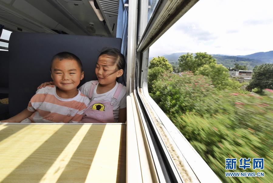 2020年8月14日,吴思语(右)带着弟弟吴思远乘坐“小慢车”前往西昌走亲戚。穿越四川凉山彝族自治州往返于普雄和攀枝花之间的5633/5634次列车,全列13节车厢,走满全程353公里需要9个多小时。慢悠悠的火车沿途要停靠26个站,如同一座流动的村庄,尽自己最大能力解决沿途百姓出行问题。