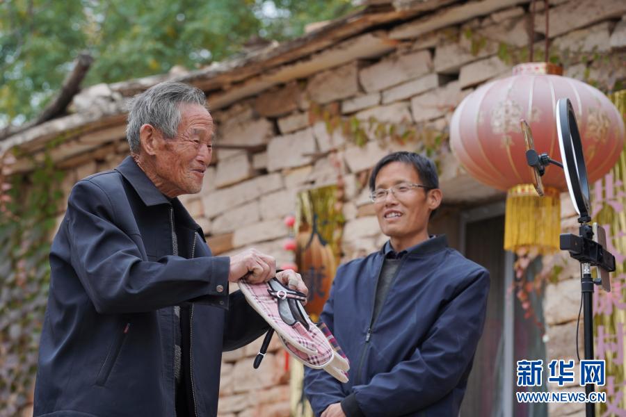 2020年10月28日,河北省沙河市柴关乡大康村老支书李三平(左)在直播中推介村民手工制作的布鞋。今年年初,李三平在儿子李庆斌直播推介农产品的过程中,应网友的要求加入直播,收获了众多网友点赞。在他的努力下,大康村的小米、蜂蜜等货品销路越来越广,慕名前来的游客也更多了。