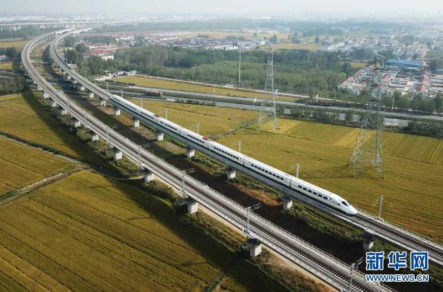2020年10月10日,一列动车组列车行驶在江苏连云港市境内(无人机照片)。