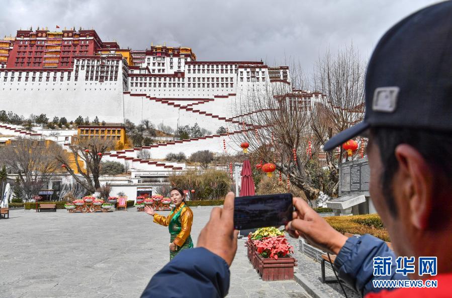 2020年3月1日,西藏布达拉宫管理处的讲解员次仁卓嘎(左)在进行直播。