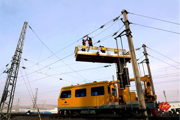 图为新朔铁路供电作业人员对接触网进行平推检修保障供电安全