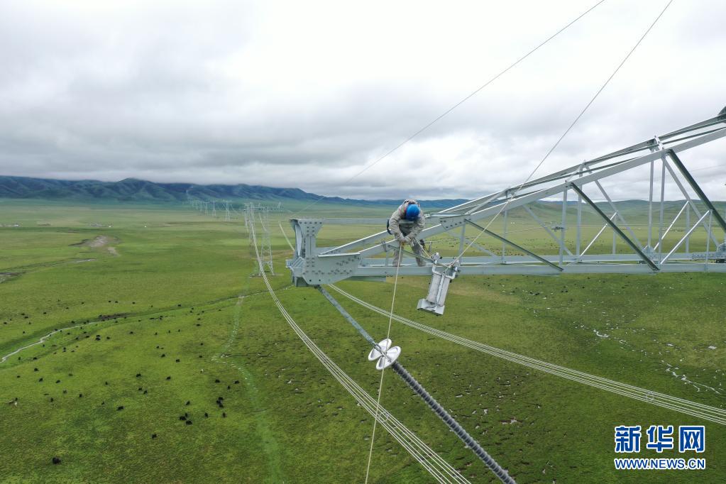 6月17日,在青海省黄南藏族自治州河南蒙古族自治县,国网青海省电力检修公司专业人员在青豫特高压直流输电线作业。 新华社发(谢莉蓉 摄)