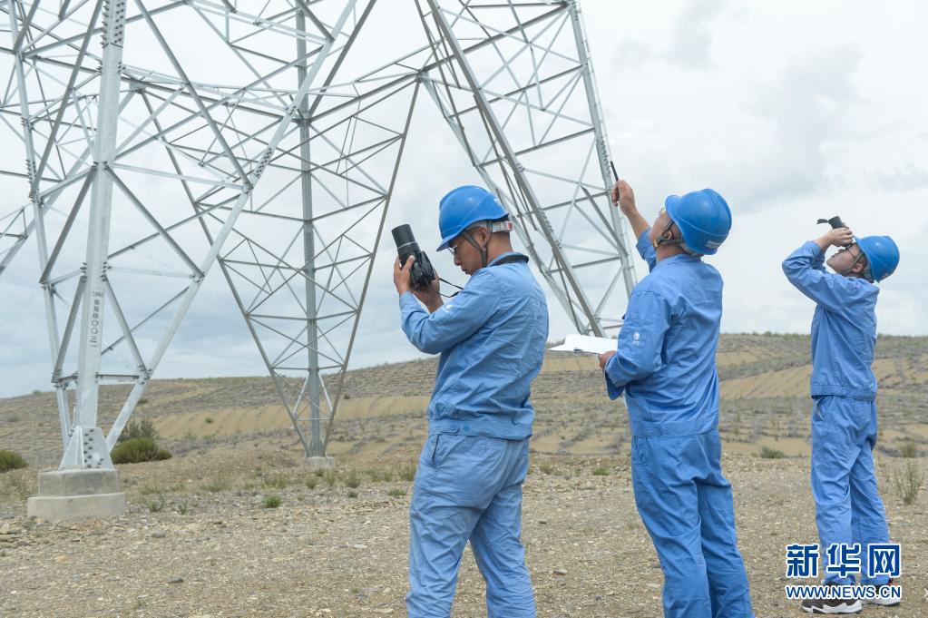 7月9日,在青海省海南藏族自治州共和县塔拉滩,国网青海省电力检修公司输电检修中心的工作人员在现场作业。 新华社记者 张曼怡 摄